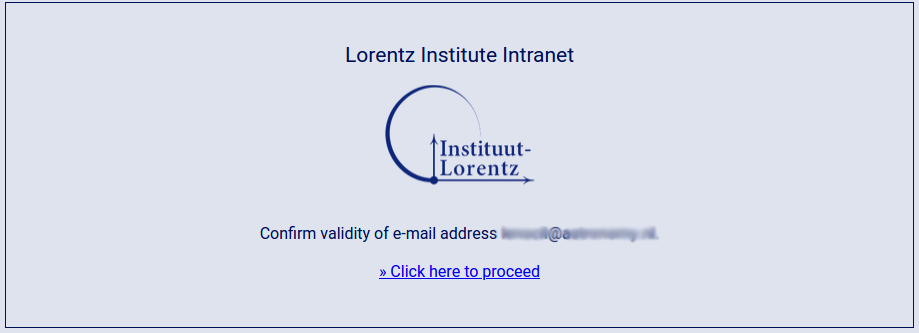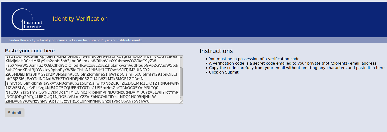 Verify your identity by visiting your private email inbox. You should have received an email from the Lorentz Institute Identity Provider 1). Open that email and copy (for instance using on most platforms Control-C or right-mouse click copy) the secret code in the body of the message. Visit https://www.lorentz.leidenuniv.nl/idp/ and paste (on most platforms Control-P or right-mouse click paste) the secret code in the white text area. Click on `Submit'. Your identity is now verified.