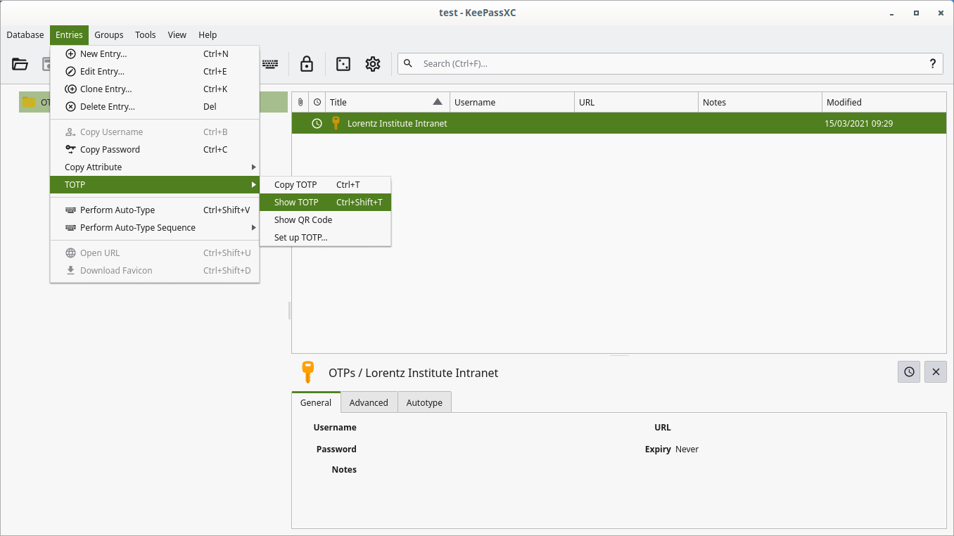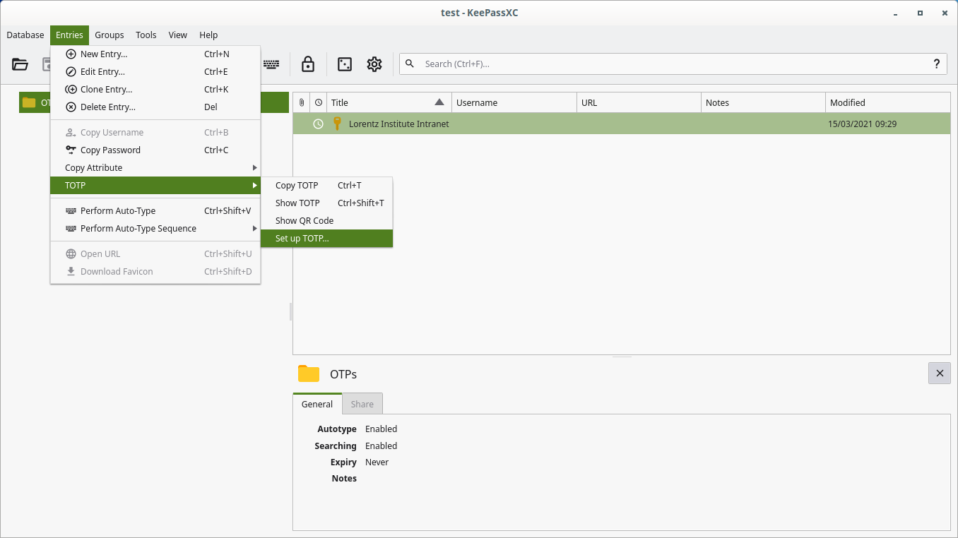 Open KeePassXC (installed on all IL workstations), create a new passwords database if you do not want to use an existing one and click on Entries → TOTP → Set Up TOTP. Insert your private key, algorithm, time interval and number of digits from Step 2 and confirm by clicking on `OK'.