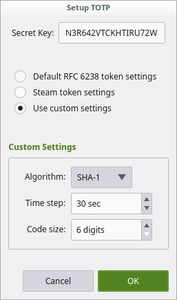 Note the secret key, the algorithm, the number of digits, and the time interval. You will need them in Step 3.