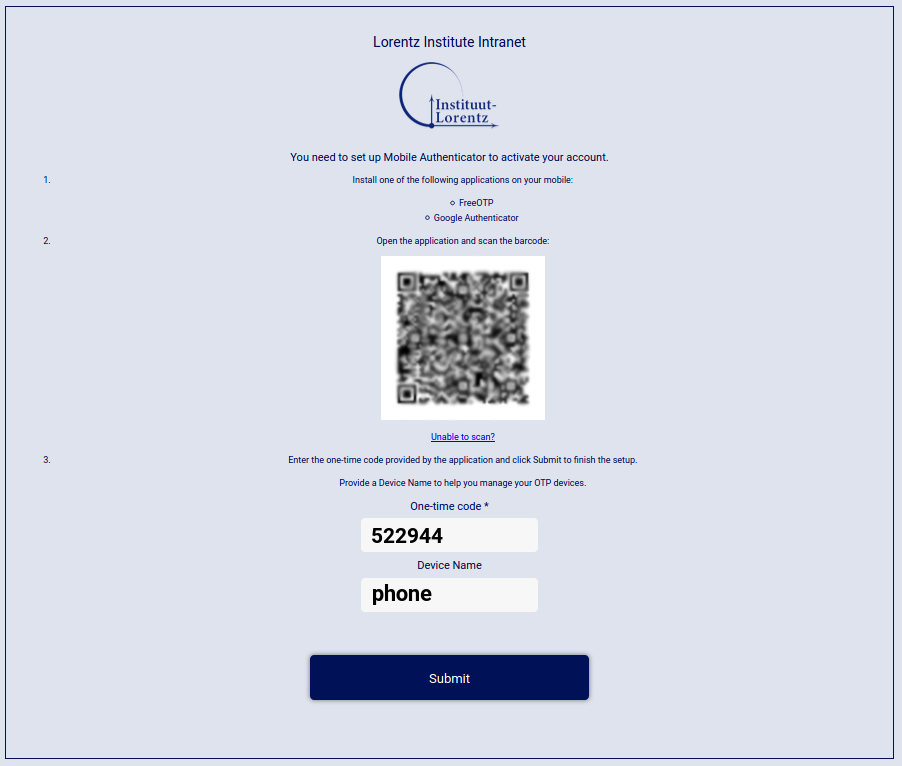 Open your OTP app and scan the QR code. Your secret key will now be stored on your phone and a new entry called Lorentz Institute Intranet with its corresponding TOTP will be created in your app (Figure 3). Insert this TOTP in the One-time code form input and, if you wish, a label in the form input called Device Name. This label is meant to help you keep track with which device the secret key has been shared. Click on Submit.