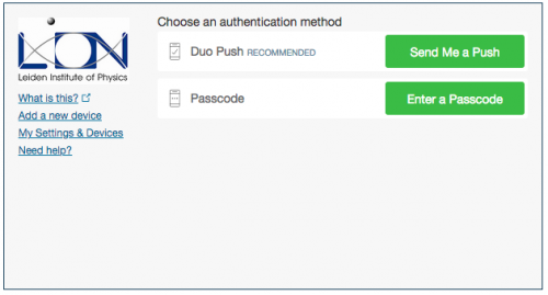 The easiest mechanism is the push mechanism were you only have to hit the approve button in the DUO app on your smart phone to login. The passcode can be obtained by clicking the created LION entry in the DUO app. It will show a six digit code that you can enter in above window, second option. before you can enter this six digit code, you first need to pressthe ' Passcode' button. Once the code is accepted or you pressed the Approve button on the DUO app, you are forwarded to the Web sit.