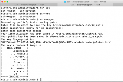The procedure is very similar to the Linux procedure. So we first need to build a public/private keypair using the ssh-keygen utility (note here the default rsa key is generated, but it is more secure to generate an ecdsa key like ssh-keygen -t ecdsa: